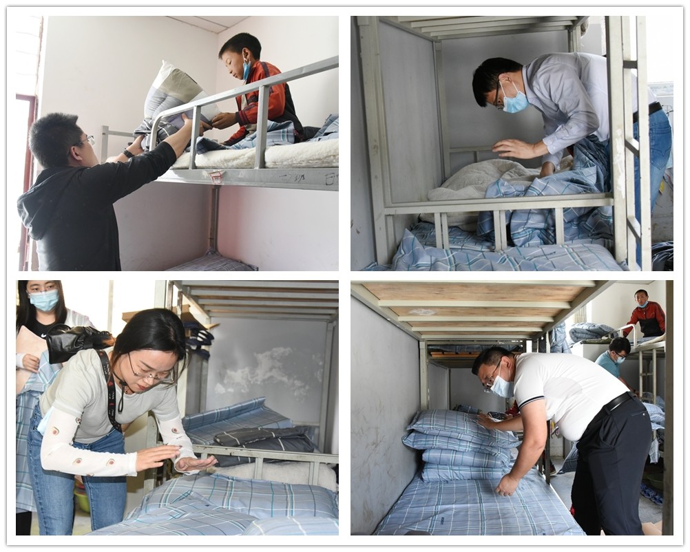 學員們和學生一起鋪設嶄新的床單、被套等